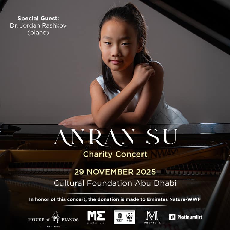 Address: Cultural Foundation – Rashid Bin Saeed Al Maktoum St(2nd St) – Abu Dhabi – United Arab Emirate How to get there: By car: You can drive to the Cultural Foundation from anywhere in Abu Dhabi. You can park there for a small fee. By public transport: The Cultural Foundation is accessible by bus. The nearest bus station would be Abu Dhabi Bus station which is 1.2 Kilometeres away from the Cultural Foundation. By taxi: You can also take a taxi to the Cultural Foundation. It’s a famous destination and most drivers would be familiar with its location. Join us for an unforgettable charity concert presented by M Premiere, as 9-year-old Chinese piano prodigy Anran Su takes to the stage for a dazzling solo recital on 29 November 2025 at the Cultural Foundation Abu Dhabi.