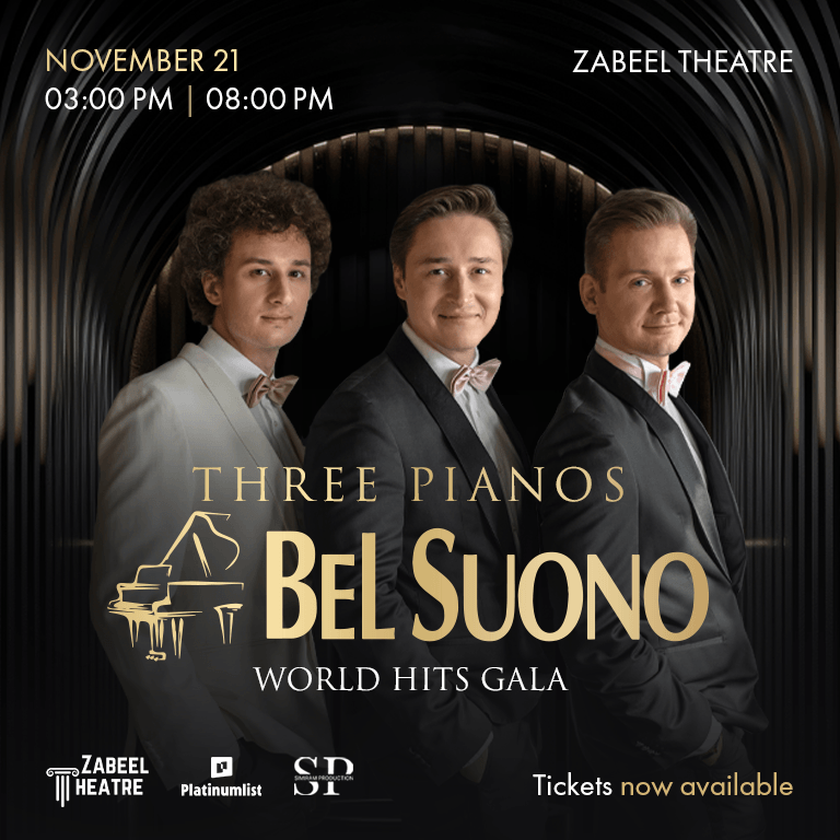 How to get there: By car: Take Sheikh Zayed Road (E11), exit onto Al Safa Street, turn left onto King Salman Bin Abdulaziz Al Saud Street, and find the theater within the hotel premises.  By taxi: You can also take a taxi to the hotel from anywhere in Dubai. It’s a popular destination, and most taxi drivers will be familiar with the location. Prepare for an evening that will change the way you think about classical music. Bel Suono is neither a chamber concert nor a traditional academic performance. It is a spectacular three-piano show where Tchaikovsky meets Queen, Vivaldi, and Flight of the Bumblebee,resulting in a breathtaking musical ride. Rooted in the precision of the Moscow Conservatory, powered by the energy of the 21st century, Bel Suono is a cultural experience that blends art and emotion. Bel Suono: Three Pianos World Hits Gala at Zabeel Theatre, Dubai at Zabeel Theatre, Jumeirah Zabeel Saray Hotel, Dubai, United Arab Emirates events Shows and Theatrical Plays Zabeel Theatre – Jumeirah Zabeel Saray