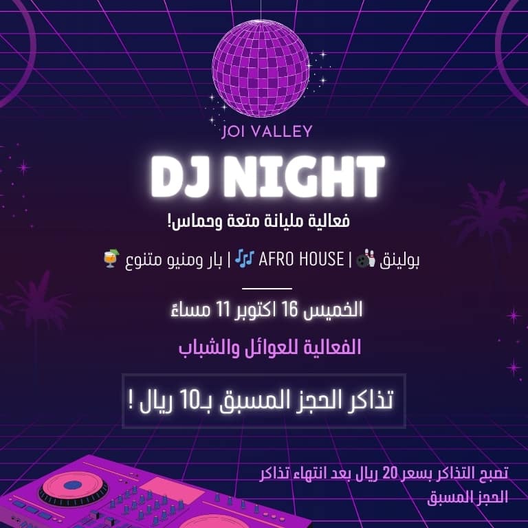 Book your ticket now and live a unique experience in a day designed just for you DJ NIGHT in Taif at Qouraish, Al Sadad, Taif 26514 events Nightlife Joi Valley