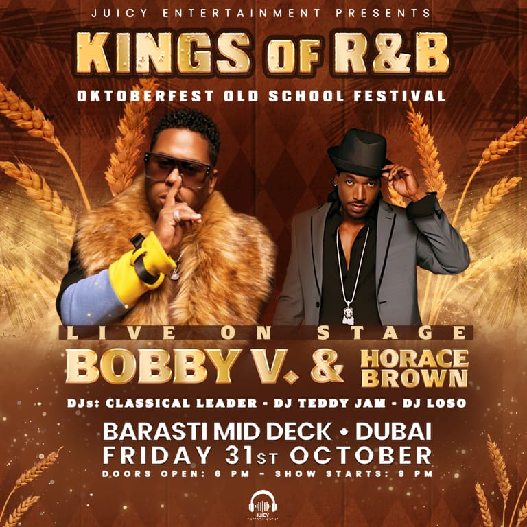 – Kings of R&B – Halloween Old School Festival This Halloween, get ready for a night of smooth grooves, timeless classics, and pure R&B soul as Juicy Entertainment proudly presents Kings of R&B – Halloween Old School Festival at the legendary Barasti Beach, Dubai on Friday, 31st October. Live on stage: